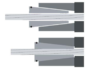 Закрепление канатов на анкере производится с помощью цанговых захватов. Цанги выполняют функцию клина, при передаче нагрузки цанги расклиниваются в конусообразной выемке анкера, удерживая канат. Надежность сцепления каната и цанг обеспечивает резьба на внутренней стороне цанг. Нагрузка с анкеров передается на конструкцию через опорные пластины или анкерные стаканы. Для обеспечения прочности бетона в зоне передачи нагрузки устраивается конструктивное армирование.