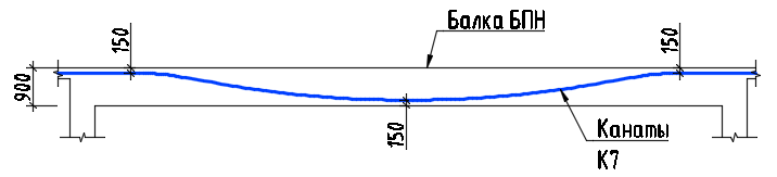 Раскладка канатов: стандартная параболическая. Отступ канатов по вертикали от граней балки в характерных точках 150 мм. Отступ канатов принимается из требований конструирования, в стандартных случаях 125-150 мм.