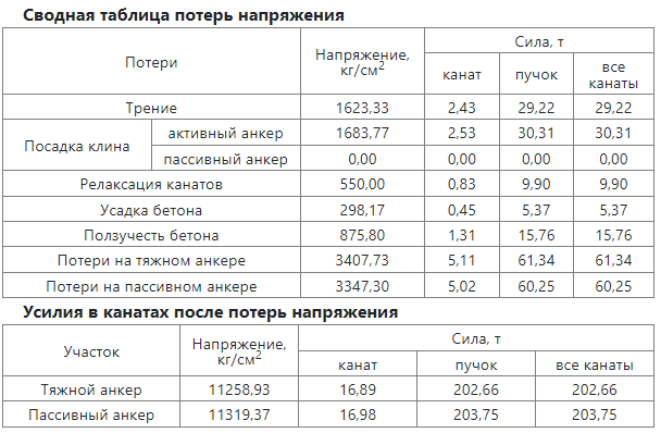 Определим усилия в канатах после всех потерь. Расчет потерь напряжения можно выполнить здесь.