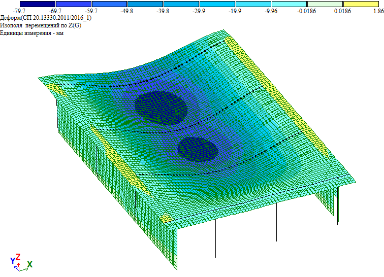 Прогиб перекрытия с учетом преднапряжения из расчета схемы: 57,9 мм.