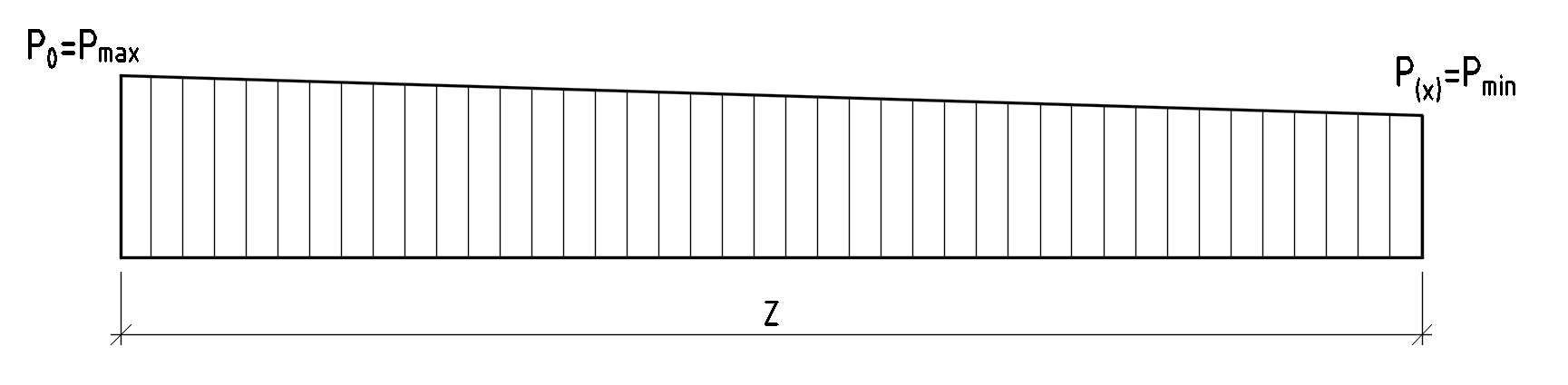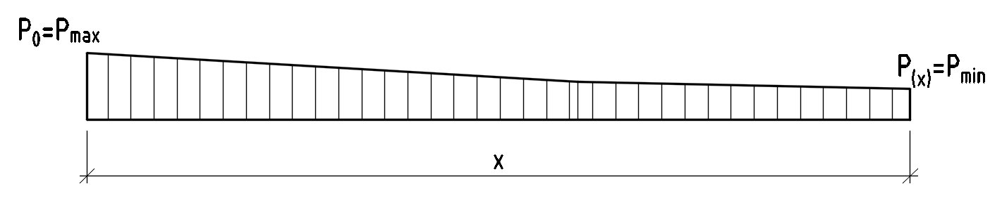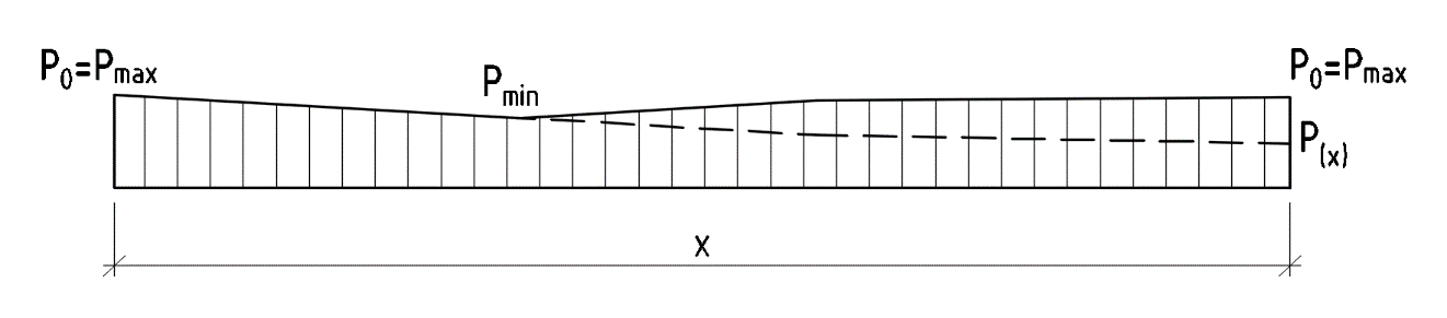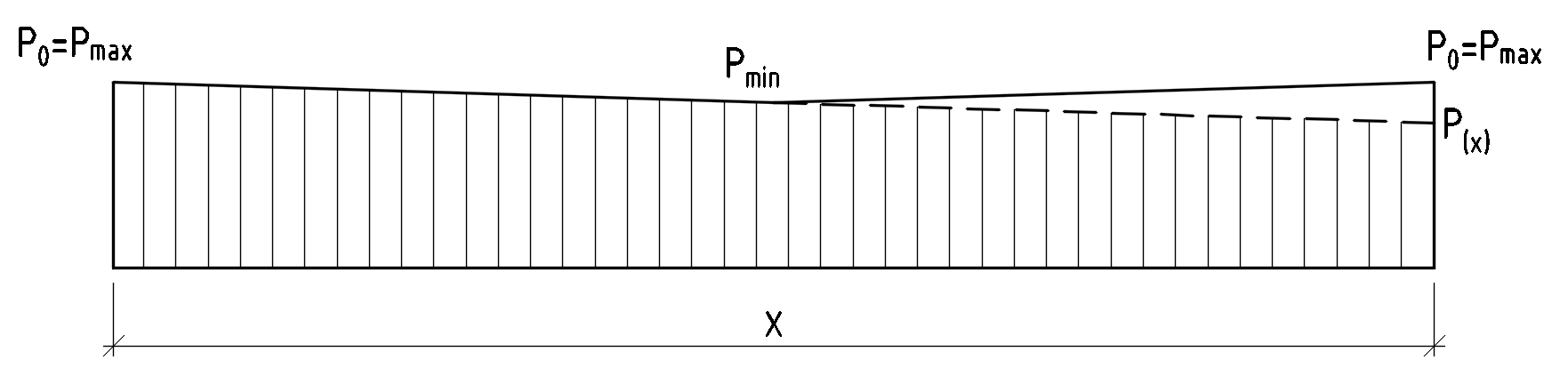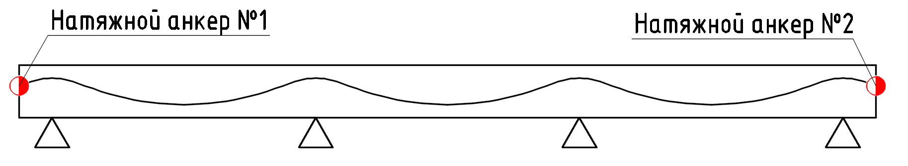 Последовательное натяжение с двух сторон позволяет существенно минимизировать потери на трение. В случае симметричной раскладки каната (рис. 1) эпюра усилий в канате при натяжении на первом натяжном анкере примет вид согласно рис. 2. После натяжения на втором натяжном анкере эпюра будет соответствовать рис 3.