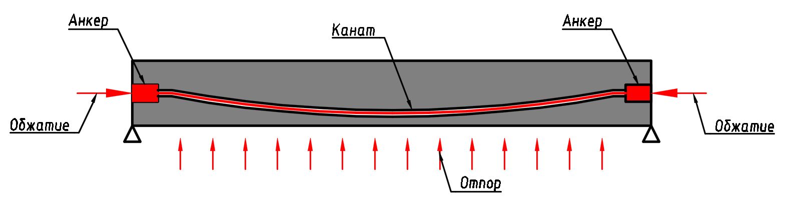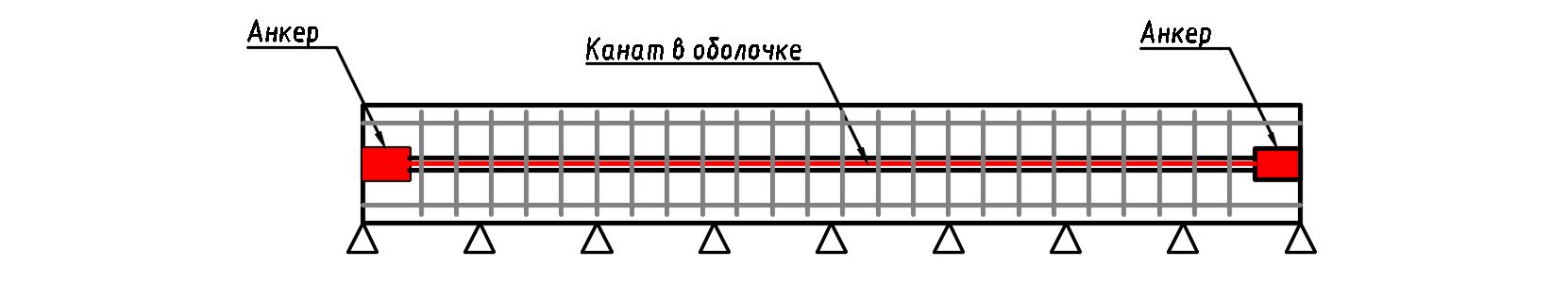 После набора бетоном необходимой передаточной прочности канаты раскрепляются на упорах и усилие с канатов передается на конструкцию за счет сцепления канатов с бетоном.
