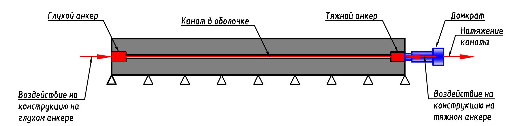 После натяжения канат также закрепляется на анкере, а домкрат снимается. Силы от сжатия каната передаются на конструкцию в точках его закрепления, т.е. на анкерах. Усилие от натяжения каната остается в конструкции на протяжении всего срока ее эксплуатации.